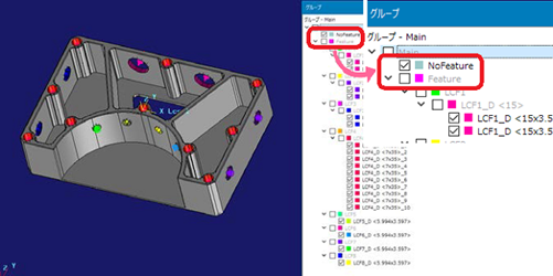 フィーチャーは、穴の直径・深さ・加工軸の向きを自動抽出し、それらの種類によって作られたグループの中に作成されます。穴の方向によってグループ分のローカル座標も作成します。