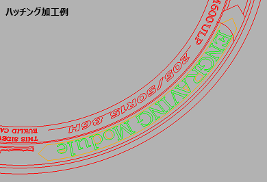 オレンジ色の輪郭内を緑色の輪郭を残し、任意カーブのハッチングを行う