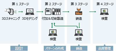 |  |  |  |  |  |  リバースエンジニアリングとは 3Dスキャナで現物を3DデータとしてPCに読み込み、スキャンデータを参照として3D-CADデータに変換します。用途に合わせて寸法等の設計要素を付け加え、設計データへ変換します。   ワークフロー