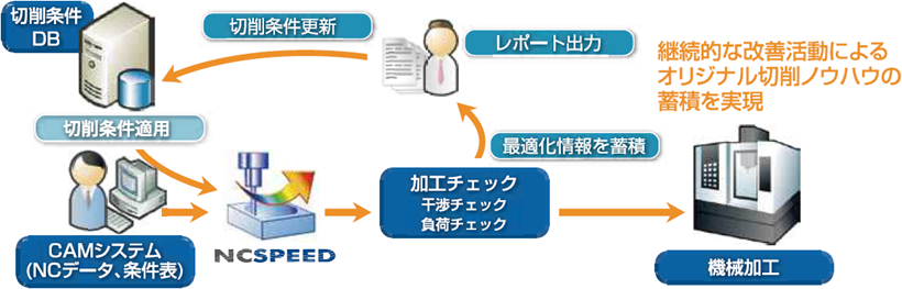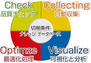 NCSPEEDは品質チェック、最適化処理、そして使い込むことで既存の切削条件が追加/更新されていくデータ自動収集、さらに集約した切削条件や切削ノウハウを可視化し分析するための可視化/分析をモジュールとして揃え切削加工における”知の集約”を実現するソリューションとしてご提案いたします。